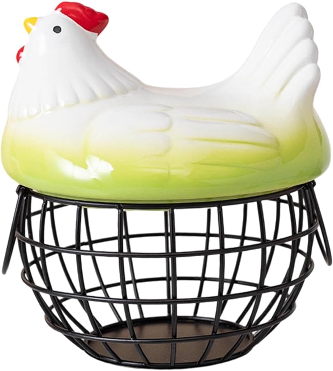 Description: - 【Creative Design】The metal wire egg basket features a hen shaped lid that adds a playful decorative touch to your kitchen while keeping essentials organized - 【Material】Crafted from sturdy ceramic and iron material, this chicken egg basket ensures sturdy use and reliable support for your eggs, fruits, and snacks - 【Large Capacity】The fresh egg collecting basket with a spacious interior easily holds eggs, fruits, garlic, potatoes, or other kitchen items for convenient storage and easy access - 【With Lid】The fresh egg holder with a lid, which is creative and decorative - 【Easy Access】 The versatile storage basket allows you to quickly grab what you need while keeping your countertop neat and tidySpecification: - Material: Ceramic, IronSize Chart:19.5cmx24.8cm/7.68inchx9.76inchPackage Includes:1 Chicken Egg Basket