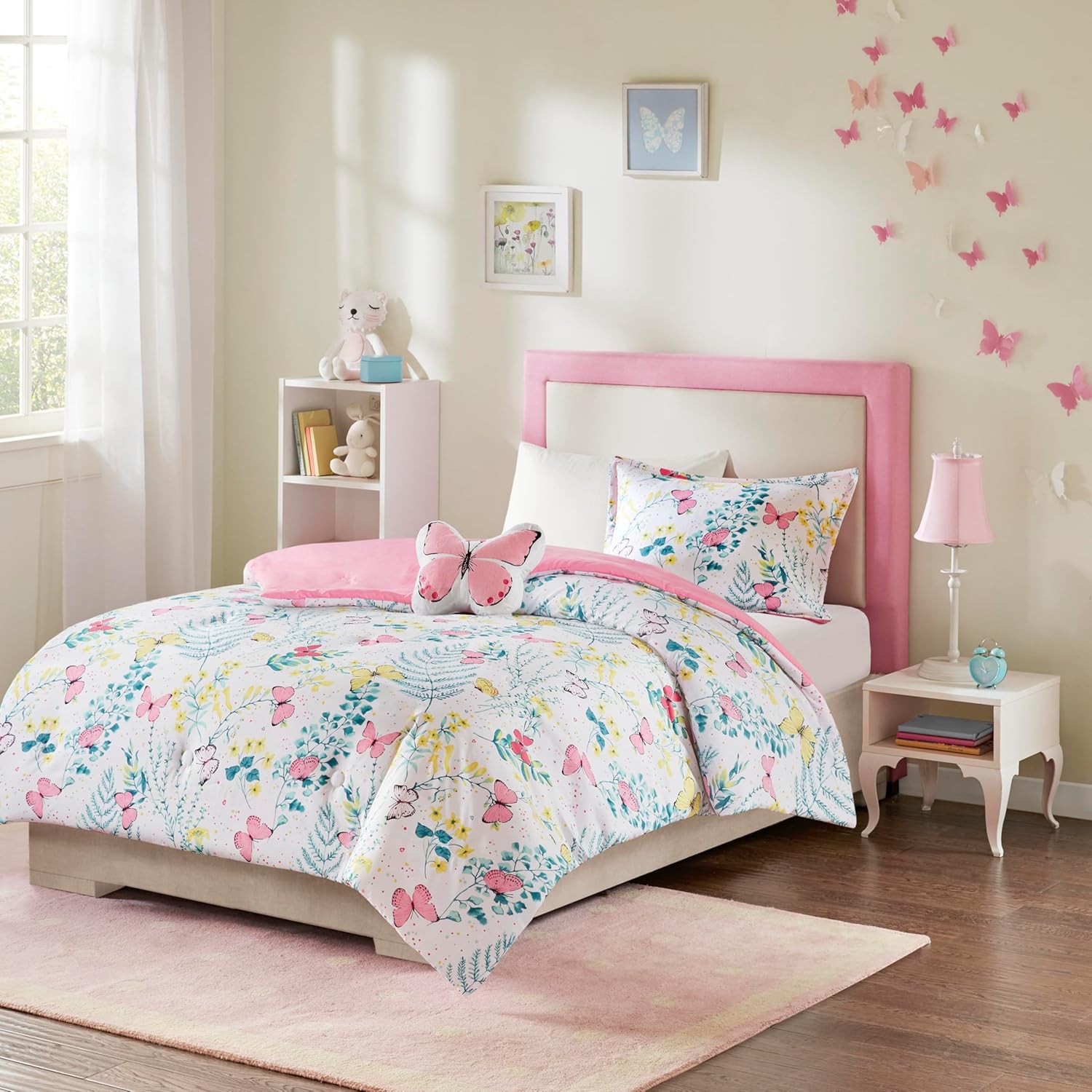 Create sweet dreams with the adorable elegance of the Intelligent Design Kids Celia Starry Sky Metallic Printed Comforter Set. The girl’s comforter flaunts gold metallic stars and moons that sparkle against the soft fabric, for a magical celestial look. The 2 matching shams (1 in Twin) repeat the pattern of the starry comforter and a round decorative pillow with embroidered details adds a cute finishing touch. Items in the set may come in a rolled or compressed packaging, which will need to be fluffed up or steam ironed before use to remove wrinkles.