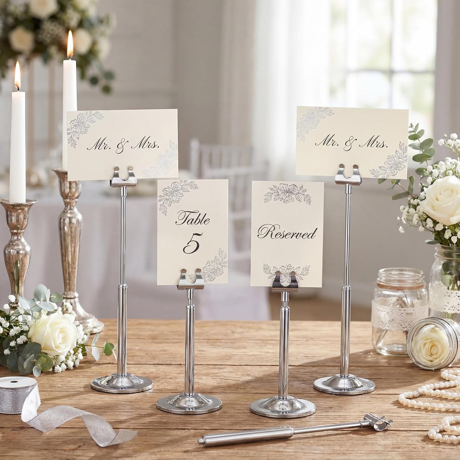 Features: Minimalist and Stylish Design: These table card holders feature a clean and streamlined design that attracts guests' attention without appearing cluttered. Their understated elegance elevates the style of any setting, instantly adding ambiance to your event and making them ideal for various occasions. Multi-functional Place Card Holder: This place card holder is not only suitable for table place cards but can also be applied as a wedding number holder, adding a touch of sophistication and elegance. Whether it's a reception, party, restaurant, or corporate event, it adapts perfectly, adding a touch of class and chic to your event. Specifications: Material: metal Color: silver Size: 4.9-7.3 inch Package includes: 12 x Table number holders Notes: Manual measurement, please allow slight errors on size. The color may exist a slight difference due to different screen displays.