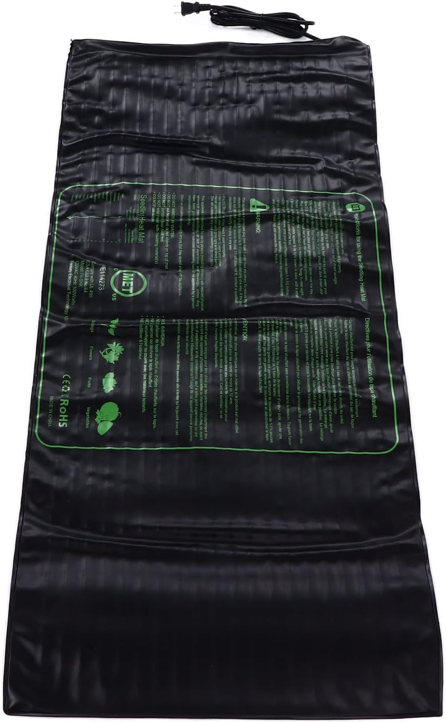 Specification:Item Type: Seedling Heat MatMaterial: PVC, siliconeProduct Size: Approx. 122 x 50.8 cm / 48 x 20 inVoltage: US plug 110VRated Power: 100WHeat Resistance: 105°CWithstand Voltage: 300VFire Rating: VW-1Application: Seed germination and seedling reproductionWeight: Approx. 1432g / 50.5ozPackage List:1 x Seedling Heat Mat